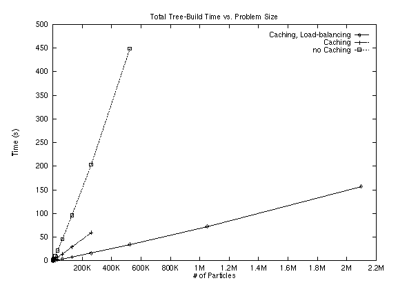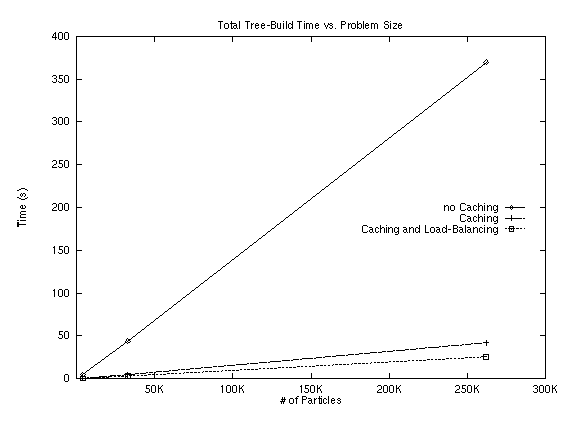 One piece of information not provided in the Splash-2 papers was the number of retries for acquiring the lock on a node. Our implementation has many fewer locks because we only lock to split a leaf. Regardless, in some runs with 4096 bodies, we saw in excess of 12,000 retries for a lock. This indicates that it is very important that the algorithm process multiple insertions at a single time. This benefits the program in two ways. First, handling multiple insertions at a single time will allow overlapping the addition of bodies into leaves, and retrieval of internal nodes if necessary. Second, it will reduce lock contention because a processor can work on inserting another body, which may end up being stored locally while it is waiting for the lock to become free.